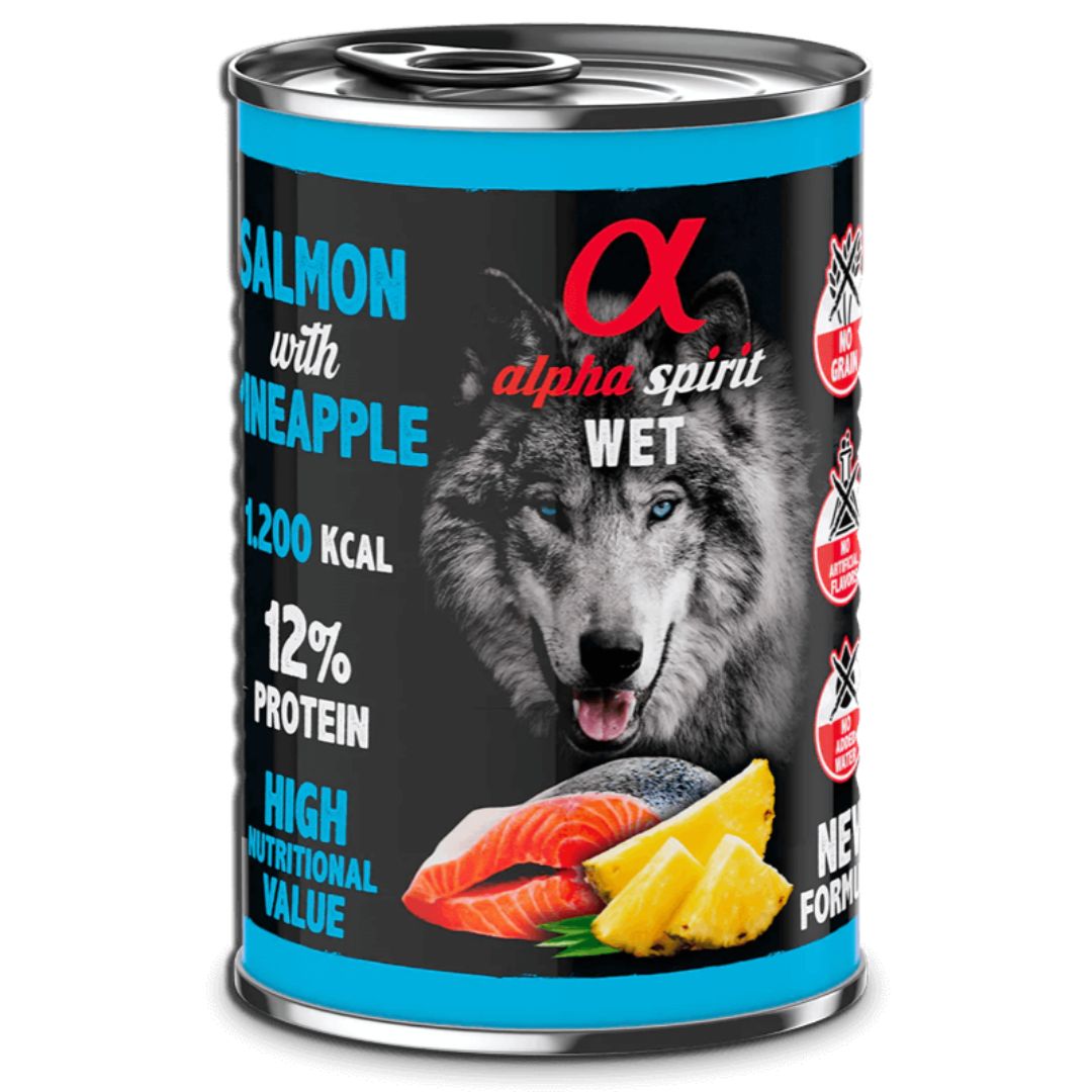 Az Alpha Spirit – Lazac és Ananász konzerveledel friss húsból, gyümölcsökkel kiegészítve készül. Egyfajta fehérjeforrást tartalmazó nedves-eledel, amelyet kifejezetten érzékeny emésztésű és/vagy allergiában szenvedő kedvenceknek fejlesztettek ki.