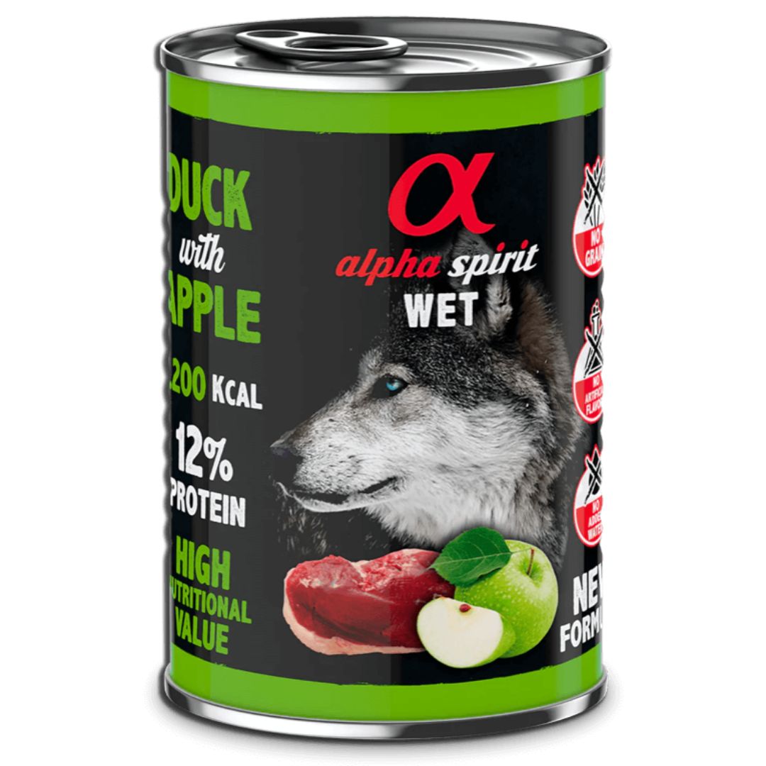 Az Alpha Spirit – Kacsa és Zöld Alma egy teljes értékű, nedves eledel minden fajtájú és életkorú kutya számára csirke- és kacsahússal, no meg egy kis zöld almával.