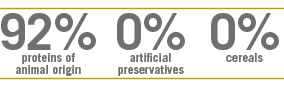 - Kiváló, emberi fogyasztásra alkalmas fehérjeforrás – főként bárány, vaddisznó, csirke, hal és a tojás – felhasználása, friss és magas biológiai értékű húsokból. A dehidratált csirkehús Olaszországból, szabadon tartott, frissen vágott egész csirkéből származik, nem tartalmaz tollakat vagy más melléktermékeket. Ezek a nyersanyagok magas biológiai értékű fehérjéket tartalmaznak, amelyek 95%-ban emészthetőek.