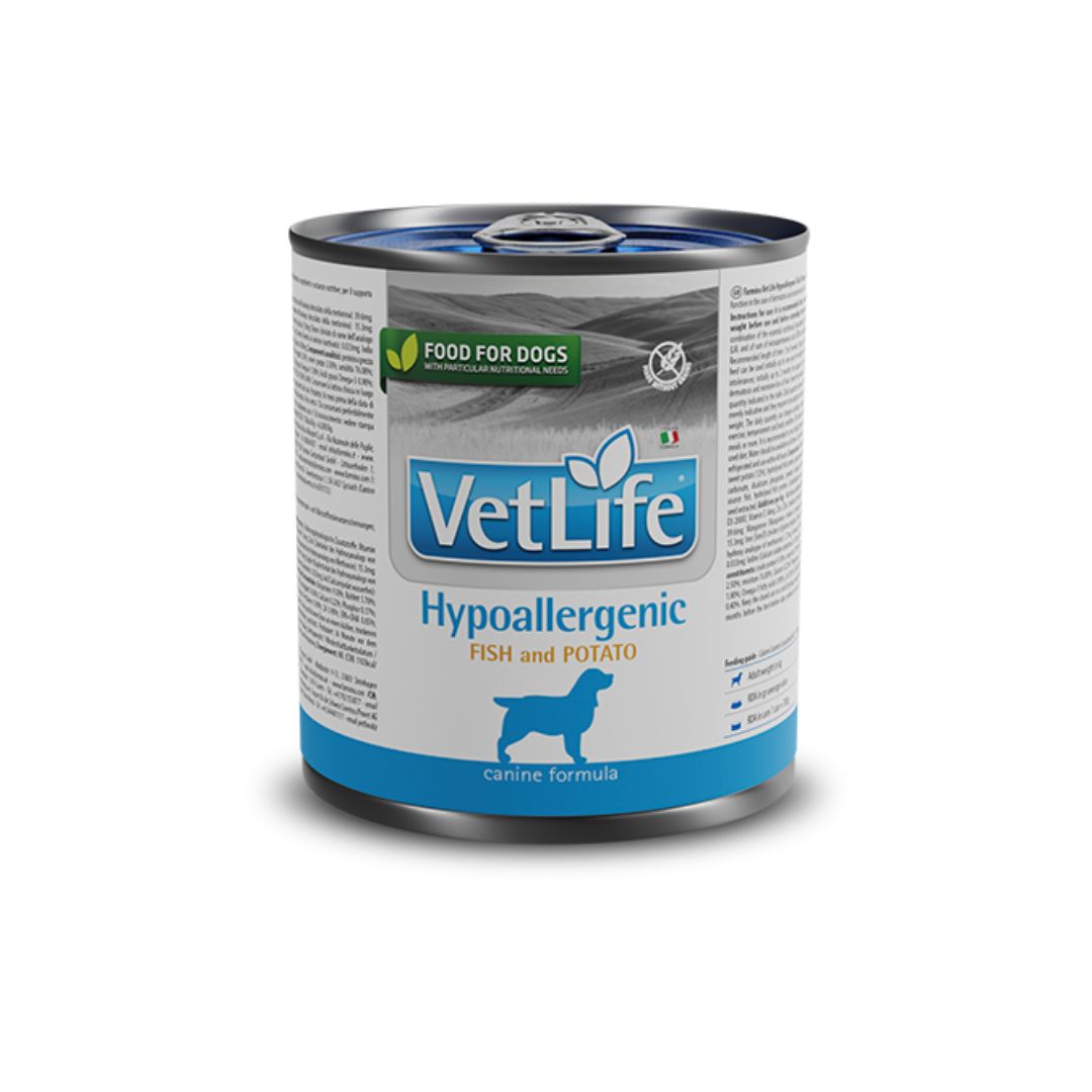 A Vet Life Hypoallergenic Fish & Potato konzerveledel egy teljes értékű diétás táp felnőtt kutyák számára, táplálékintolerancia csökkentésére kifejlesztve. Bőr- és szőrproblémákkal, illetve kötőhártya-, külső hallójárat-, és a bűzmirigy gyulladásos megbetegedéseivel küszködő kutyák kiegészítő kezelésére is ajánlható.